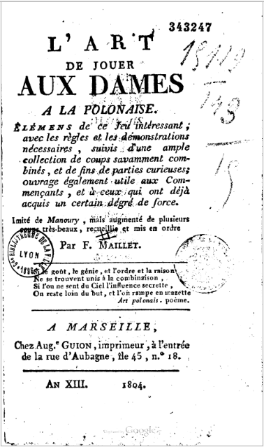 1804 L'art de jouer Aux Dames a la Polonaise F. Maillet |